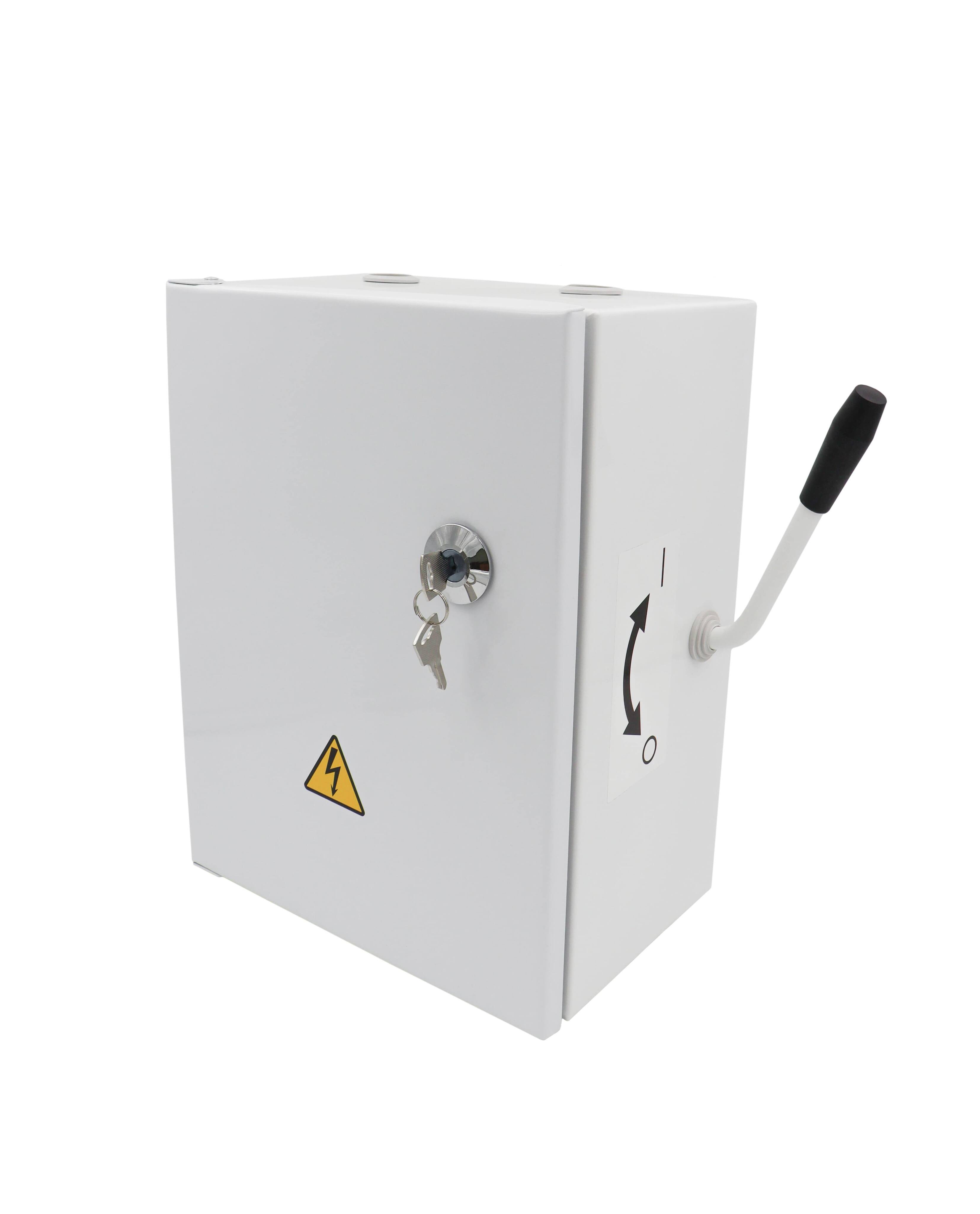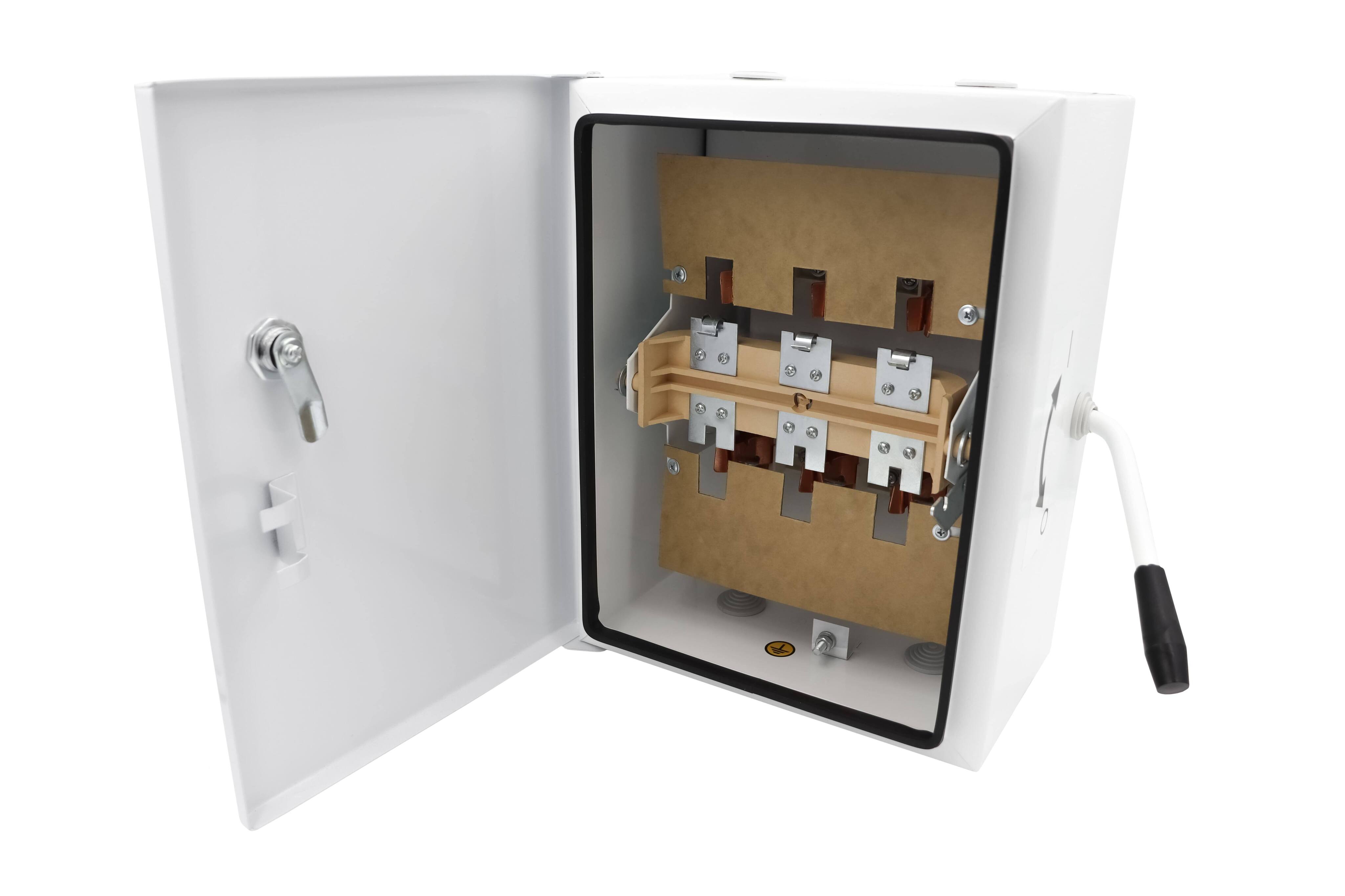 Ящик силовой с блоком "предохранитель - выключатель" унифицированный (ЯБПВУ-1 100А) (fuse-switch): Выключатель, у которого плавкая вставка или держатель с плавкой вставкой образуют подвижный контакт.НАЗНАЧЕНИЕ Ящик ЯБПВУ-1 предназначен для нечастых включений и отключений, а также для защиты электрических сетей и приемников от недопустимых длительных перегрузок и токов короткого замыкания. Ящики применяются в электрических установках как переменного, так и постоянного тока.КОНСТРУКЦИЯЯщик представляет собой металлический корпус с выпуклой дверцей, в котором закреплен подвижный блок, на котором закреплены предохранители, выполняющие функцию подвижного контакта. Имеется возможность блокировки дверки.ТЕХНИЧЕСКИЕ ДАННЫЕ Номинальный ток предохранителей: 25, 50, 63, 80, 100А