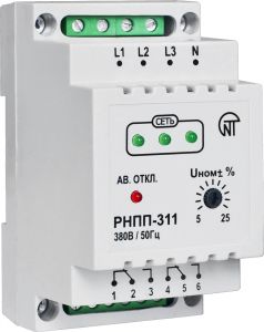Реле напряжения РНПП-311 предназначено для защиты трехфазных потребителей от основных видов аварии в электрической сети, таких как: - выход действующего значения напряжения за пределы допустимых порогов - нарушения чередования и слипание фаз - нарушения полнофазности и симметричности сетевого напряжения Устройство контролирует основные параметры электрической сети и при их отклонении отключает нагрузку. Включение нагрузки РНПП-311 производит автоматически по истечению времени АПВ (автоматического повторного включения) с момента восстановления параметров электрической сети. Выпускаются устройства со стандартным временем АПВ 5 секунд, однако под заказ потребителя возможен выпуск изделий со временем АПВ 0, 10, 60, 100, 150, 200 и 250 секунд. Независимое питание внутренней схемы реле от каждой из 3-х фаз. Цифровая обработка сигнала напряжения. Реле не требует дополнительной отладки и настройки потребителем, т.к. выставленная регулируемая и зафиксированные уставки достаточно точно выверены и не зависят от внешних факторов. Наличие точной регулировки по напряжению в широком диапазоне. Возможность изменения, по желанию заказчика, диапазона регулируемой уставки и величин зафиксированных уставок. Гальванически развязанная цепь питания катушки пускателя с силовыми цепями. Индикация наличия напряжения по каждой фазе, наличие индикации аварийного срабатывания. Коэффициент возврата (гистерезис) по отключению/включению как по Umах, так и по Umin, в пределах 6-7 В. Реле сохраняет работоспособность в диапазоне 30-150 % от номинального напряжения, а также при наличии хотя бы одной из фаз. Крепление на стандартную DIN- рейку. Напряжение питания Линейное: 380В