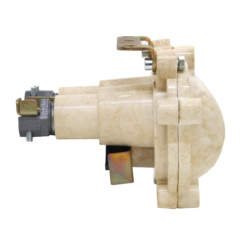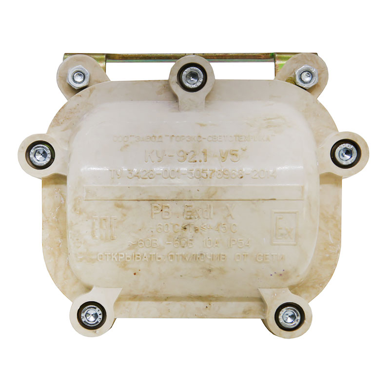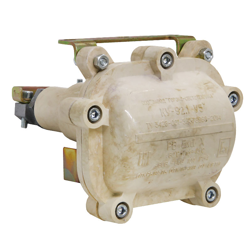 Пост управления КУ-92 Посты управления кнопочные серии КУ предназначены для дистанционного управления электроприводами машин и механизмов в стационарных установках во взрывоопасных зонах помещений и наружных установок, а также в шахтах, опасных по газу (метану) и угольной пыли. Конструкция Посты КУ-92 выпускаются в двух исполнениях: · КУ-92.1 – для подземных выработок шахт, опасных по газу (метану) и угольной пыли, · КУ-92.2 – для взрывоопасных зон помещений и наружной установки (кроме подземных выработок). Состоят из оболочки, образованной корпусом и крышкой, соединенных винтами. В корпусе под крышкой установлены кнопочные элементы. Замыкание и размыкание контактов кнопочных элементов производится поворотом скобы, закрепленной на рукоятке управления. Наличие двух кабельных вводов рассчитано на ввод гибкого или бронированного кабеля диаметром 8…12мм. Предусмотрена защита от выдергивания кабеля. Рукоятка управления выполнена как рычаг с оперативными надписями «ВКЛ», «ОТКЛ». В положении «ОТКЛ» рукоятка фиксируется