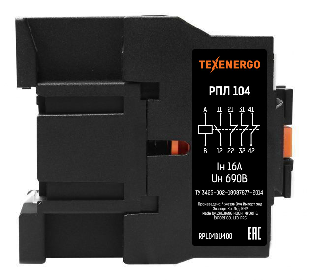 Промежуточные реле типа РПЛ-104, РПЛ-113, РПЛ-122, РПЛ-131, РПЛ-140 применяются в схемах управления электрооборудованием в стационарных промышленных установках переменного напряжения до 690 В частотой 50 и 60 Гц или в схемах управления до 440 В постоянного тока. При работе с микропроцессорной техникой катушка управления реле шунтируется ограничителем перенапряжения ОПН. Реле может быть доукомплектовано одной приставкой ПКЛ или ПВЛ. Схема управления данного реле 0НО+4НЗ: четыре нормально закрытых контакта (4НЗ). Контакты мгновенного действия. Номинальный ток контактов реле - 16 А. Исполнение по коммутационной износостойкости в режиме нормальных коммутаций - класс Б или 1.600.000 циклов замыкания исполнительных контактов реле при номинальных токах не более 16 А. Катушка управления реле: 400 В переменного тока частотой 50/60 Гц.