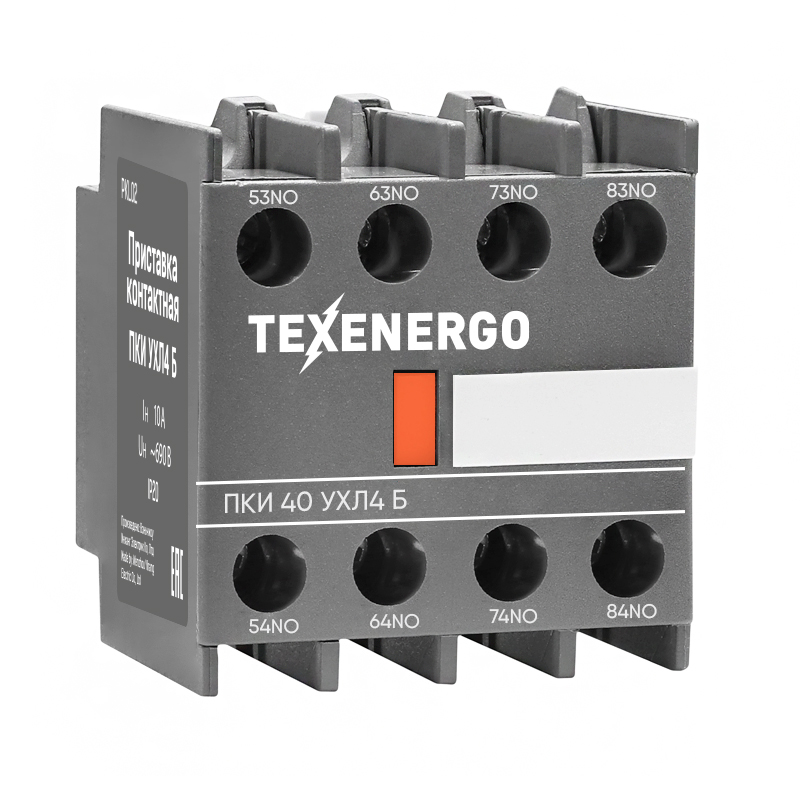 Приставки контактные ПКИ, предназначены для увеличения количества вспомогательных контактов на электромагнитных пускателях типа КМИ. Приставки разработаны с целью расширения возможностей использования электромагнитных контакторов и пускателей в различных производственных сферах, когда появляется необходимость увеличения цепей вторичной коммутации в системах автоматизации и дистанционного управления. Приставки выпускаются с двумя или четырьмя мостиковыми контактами и различными схемами (комбинациями) замыкающих и размыкающих контактов. Приставки фиксируются на пускателях с помощью специальных защелок. Вспомогательные контакты используются в цепях управления и сигнализации. Приставки ПКИ, производства ТЕХЭНЕРГО, являются наиболее востребованным изделием на рынке и отличаются оптимальным сочетанием цены и качества. Схема контактной группы: 4 замыкающих контакта. СТРУКТУРА УСЛОВНОГО ОБОЗНАЧЕНИЯ: ПКИ ХХМ О4 Х ТЭ - первая цифра в обозначении (количество замыкающих контактов) - вторая цифра в обозначении (количество размыкающих контактов) - буква М - IP20 (отсутствие буквы - IP00) - климатическое исполнение (О) и категория размещения (4) - исполнение по коммутационной износостойкости (А, Б) Номинальное напряжение по изоляции - 660 В. Номинальный ток контактов: 10А Допускается применение приставок цепях управления с номинальным напряжением до 380 В переменного тока частоты 50, 60 Гц и 220 В постоянного тока Степень защиты IP20 по ГОСТ 14254-96. Приставки предназначены для использования в следующих условиях: • температура окружающей среды от -40 до +55°С, • высота над уровнем моря не более 2000 м. • условия эксплуатации М7 по ГОСТ 17516.1-90. Габаритные размеры, мм- 45,1х48,3х38 Масса, кг, не более - 0,055