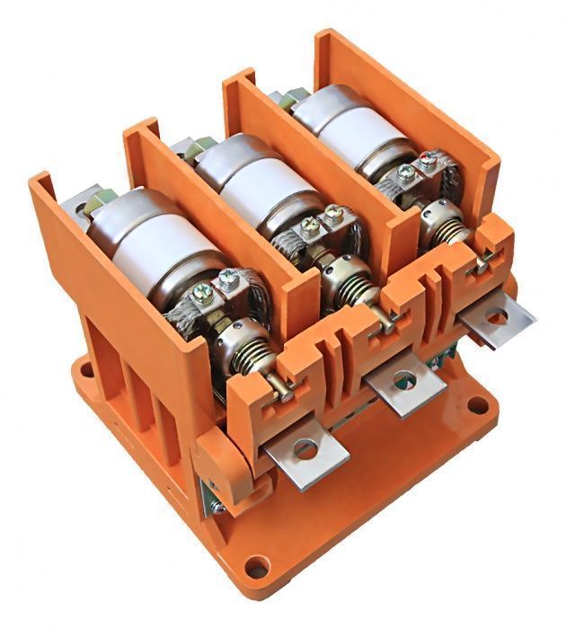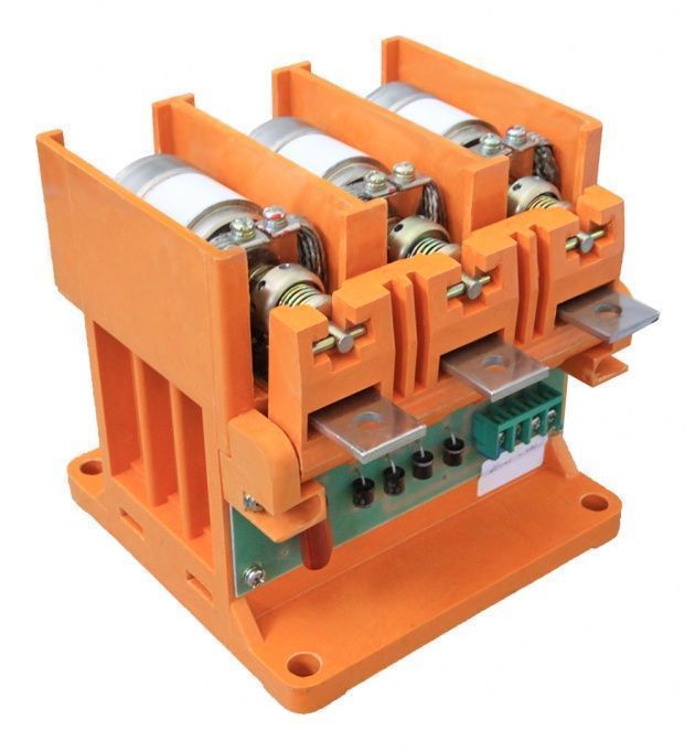 Контакторы вакуумные КВ открытого исполнения с естественным воздушным охлаждением, предназначены для включения и отключения приемников электрической энергии переменного тока с номинальным рабочим напряжением до1140 В. Отличительной особенностью контакторов является вакуумная камера, в которой расположены силовые контакты. За счет нахождения контактов в вакууме гашение дуги происходит наиболее эффективным способом, поэтому вакуумные контакторы характеризуются небольшими габаритными размерами и малой массой. Они рассчитаны на длительный срок службы при минимальных затратах на обслуживание. При этом силовые контакты не подвержены влиянию внешней среды, как загрязнение, попадание посторонних веществ, влажности и т.п., что сказывается на надежности и эффективности работы контактора, в результате чего контактор имеет повышенный рабочий ресурс. Современные технологии изготовления вакуумных контакторов позволили снизить их себестоимость и сделать их доступными для основной массы потребителей. Вакуумный контактор является искробезопасным аппаратом, т.к. его силовые контакты расположены в закрытой керамической вакуумной камере и его можно применять в горнодобывающей, металлургической, нефтяной, химической промышленности и там, где необходимо обеспечение и соблюдение норм безопасности. Контактор КВ имеет в цепи управления две катушки постоянного тока, выпрямительный мост и разъем для подачи напряжения управления, как переменного, так и постоянного тока (см. схему управления в паспорте на изделие), что позволяет использовать аппарат при различных типах источников питания. Катушки управления при включении контактора переходят в режим удержания при пониженной мощности потребления электрической энергии. Контакторы предназначены для работы в следующих режимах: продолжительном, прерывисто-продолжительном, кратковременном, повторно-кратковременном Оcновные технические параметры Номинальное напряжение главной цепи: до 1,14 кВ, 50-60 Гц Номинальный ток главной цепи контактора: 100, 160, 250, 400, 630 А Напряжение управления:    - переменного тока: 380 В, 50 Гц,    - допустимое отклонение напряжения управления не более 20%, расширенная электромагнитная защита Предельная отключающая способность: 2500 А Число полюсов: 3 Число срабатываний при продолжительном режиме работы для АС-3 600 раз/ч., для АС-4 300 раз/ч. Число срабатываний при кратковременном режиме работы 2000 раз/ч. Вспомогательные контакты (блок-контакты): 2з+2р, 3з+3р, 4з+4р Вакуумная камера: керамическая Коммутационная износостойкость для АС-4: 600 тыс. Механическая износостойкость: 3 млн. Рабочие условия высота над уровнем моря не более 2000 м, температура окружающей среды: не более +40 С, при этом средняя температура за 24-часовой период не должна быть выше +35 С, минимальная температура не менее -5 С, средняя относительная влажность за месяц не более 90% при температуре +25 С, наклон в вертикальной плоскости при монтаже не более 15 градусов, отсутствие значительных ударов и вибрации, окружающая среда не должна содержать большого количества газов и пыли, не вызывать коррозии металлов и нарушения диэлектрических свойств, должна отсутствовать угроза взрыва, недопустимо прямое попадание дождя и снега, класс загрязнения окружающей среды 3.