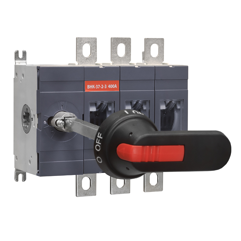 Выключатели-разъединители серии ВНК – одни из самых широко применяемых в сетях низкого напряжения. Включают различные типоисполнения по токам, видам привода и категориям применения. Предназначен для включения, пропускания и отключения переменного тока номинальным напряжением до 660 В номинальной частотой 50 и 60 Гц и постоянного тока напряжением до 440В в устройствах распределения электрической энергии. Основными узлами аппарата являются подвижные и неподвижные контакты, изготовленные из меди с гальваническим покрытием, и механизма мгновенного действия. Выключатели-разъединители серии ВНК имеют конструкцию корпуса повышенной степени жесткости. Корпус выполнен из современной, термоустойчивой пластмассы с высокими показателями пожаростойкости. В верхней части корпуса имеются защитные окошки, через которые возможно наблюдать за положением контактов.
