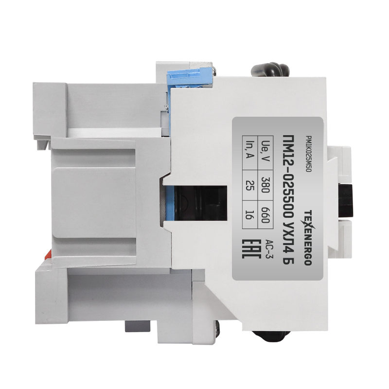 Электромагнитные пускатели ПМ12 (магнитные пускатели ПМ12, контакторы ПМ12) предназначены для пуска и остановки асинхронных двигателей с короткозамкнутым ротором. Применяются в конвейерах, станках, компрессорах, насосах, лифтах, эскалаторах, тепловых пушках, системах управления отоплением, вентиляцией и кондиционированием и т.д., а также для коммутации осветительных сетей. При наличии теплового реле, пускатель осуществляет защиту управляемого электродвигателя от перегрузок и от токов, возникающих при обрыве одной из фаз. Принцип действия: При подаче номинального напряжения на катушку она втягивает сердечник, и этим замыкает группу силовых и вспомогательных контактов. При достижении напряжения ниже порогового уровня на отпускание контакты размыкаются. Ассортимент аксессуаров для расширения функциональных возможностей пускателей ПМ12: Ссылки на аксессуары в нашем каталоге: Реле электротепловые серии РТТ, Приставки выдержки времени серии ПВЛ, Приставки контактные серии ПКЛ, Структура условного обозначения пускателей: 1. Обозначение серии 2. Цифры, указывающие условное обозначение номинального тока: 010 —10А, 025 —25А, 040 —40А, 063 —63А, 3. Цифра, указывающая условное обозначение пускателей по назначению и наличию теплового реле: 1 - нереверсивный пускатель без теплового реле, 2 - нереверсивный пускатель с тепловым реле, 5 - реверсивный пускатель без теплового реле, с мех. блокировкой и степенью защиты IP00, 6 - реверсивный пускатель с тепловым реле, с электрической и механической блокировками, 4. Цифра, указывающая исполнение пускателей по степени защиты и наличию кнопок управления: 0 - степень защиты IP00 1 - степень защиты IP54 без кнопок 2 - степень защиты IP54 с кнопками «Пуск» + «Стоп» 3 - степень защиты IP54 с кнопками «Пуск» + «Стоп» + сигнальная лампа 4 - степень защиты IP40 без кнопок 5 - степень защиты IP20 6 - степень защиты IP40 с кнопками «Пуск» + «Стоп» 7 - степень защиты IP40 «Пуск» + «Стоп» + сигнальная лампа 5. Цифра, указывающая исполнение пускателей по числу и исполнению контактов вспомогательной цепи: 0 - исполнение 1з для пускателей на номинальный ток: 10А, 25А, 40А 1 - исполнение 1р для пускателей на номинальный ток: 10А, 25А, 40А (2з+2р для пускателей на номинальный ток 63А) 6. Буква, характеризующая климатическое исполнение по ГОСТ 15150: (У) - стандартное исполнение (Т) - тропическое Скачать структуру условного обозначения пускателей ПМ12 в формате .PDF