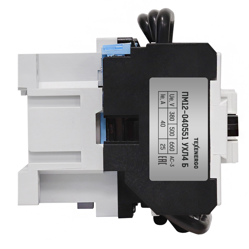 Электромагнитные пускатели ПМ12 (магнитные пускатели ПМ12, контакторы ПМ12) предназначены для пуска и остановки асинхронных двигателей с короткозамкнутым ротором. Применяются в конвейерах, станках, компрессорах, насосах, лифтах, эскалаторах, тепловых пушках, системах управления отоплением, вентиляцией и кондиционированием и т.д., а также для коммутации осветительных сетей. При наличии теплового реле, пускатель осуществляет защиту управляемого электродвигателя от перегрузок и от токов, возникающих при обрыве одной из фаз. Принцип действия: При подаче номинального напряжения на катушку она втягивает сердечник, и этим замыкает группу силовых и вспомогательных контактов. При достижении напряжения ниже порогового уровня на отпускание контакты размыкаются. Ассортимент аксессуаров для расширения функциональных возможностей пускателей ПМ12: Ссылки на аксессуары в нашем каталоге: Реле электротепловые серии РТТ, Приставки выдержки времени серии ПВЛ, Приставки контактные серии ПКЛ, Структура условного обозначения пускателей: 1. Обозначение серии 2. Цифры, указывающие условное обозначение номинального тока: 010 —10А, 025 —25А, 040 —40А, 063 —63А, 3. Цифра, указывающая условное обозначение пускателей по назначению и наличию теплового реле: 1 - нереверсивный пускатель без теплового реле, 2 - нереверсивный пускатель с тепловым реле, 5 - реверсивный пускатель без теплового реле, с мех. блокировкой и степенью защиты IP00, 6 - реверсивный пускатель с тепловым реле, с электрической и механической блокировками, 4. Цифра, указывающая исполнение пускателей по степени защиты и наличию кнопок управления: 0 - степень защиты IP00 1 - степень защиты IP54 без кнопок 2 - степень защиты IP54 с кнопками «Пуск» + «Стоп» 3 - степень защиты IP54 с кнопками «Пуск» + «Стоп» + сигнальная лампа 4 - степень защиты IP40 без кнопок 5 - степень защиты IP20 6 - степень защиты IP40 с кнопками «Пуск» + «Стоп» 7 - степень защиты IP40 «Пуск» + «Стоп» + сигнальная лампа 5. Цифра, указывающая исполнение пускателей по числу и исполнению контактов вспомогательной цепи: 0 - исполнение 1з для пускателей на номинальный ток: 10А, 25А, 40А 1 - исполнение 1р для пускателей на номинальный ток: 10А, 25А, 40А (2з+2р для пускателей на номинальный ток 63А) 6. Буква, характеризующая климатическое исполнение по ГОСТ 15150: (У) - стандартное исполнение (Т) - тропическое Скачать структуру условного обозначения пускателей ПМ12 в формате .PDF