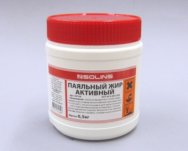 Жир паяльный активный, 500 г. Флюс паяльный низкотемпературный неводный галогенидный. Соответствует ГОСТ 19250-73 и немецкому индустриальному стандарту DIN EN 29454-1 3.1.1C. Флюс этого состава очень популярен, и выпускается многими известными фирмами. В частности в Германии он называется LÖTFETT (паяльный жир) и выпускается фирмами Stannol, Felder, ARMACK (Amasan), CHEMET Gmbh, и многими другими, включая Weller и ERSA. В Японии это BS-10 и BS-15 фирмы "goot" СОСТАВ: - Вазелин (основа) - Парафин - Цинк хлорид - Аммоний хлорид - Вода деионизированная ПРИМЕНЕНИЕ: Пайка и лужение листовых материалов из черных и цветных металлов – сталь, латунь, медная кровля, вёдра, поливочные лейки, и прочий хозяйственный инвентарь. Медные водопроводные трубы, пайка витражей (тиффани). Флюс удобно наносить на пропаиваемые швы жесткой кистью или щёткой. Высокая активность позволяет паять даже окисленные поверхности из черных и цветных металлов. Не подходит для пайки радиоэлектроники и печатных плат! (содержит хлорид цинка) НАШИ НОВОСТИ: C января 2012 г улучшен популярный флюс, используя медицинский вазелин и химически чистые реактивы от надежных поставщиков. Использовали новую герметичную тару, оставив неизменной низкую цену. Фасовка: ПЭ банка Вес: 500 г.