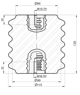 Опорный изолятор ИОР-10-7,5 I УХЛ2 для крепления токоведущих элементов электрического оборудования и распределительных аппаратов напряжением до 10 кВ. Вариант исполнения I - установочные размеры: верх - 1 отверстие М10, низ - 1 отверстие М16. Выполнен в категории УХЛ2, что позволяет устанавливать его в регионах с умеренным (У) или холодном (ХЛ) климате, на площадках расположенных как внутри помещений, так и снаружи, но защищенных от прямых попаданий осадков. Для увеличения длины пути тока утечки поверхность изолятора выполнена ребристой.
