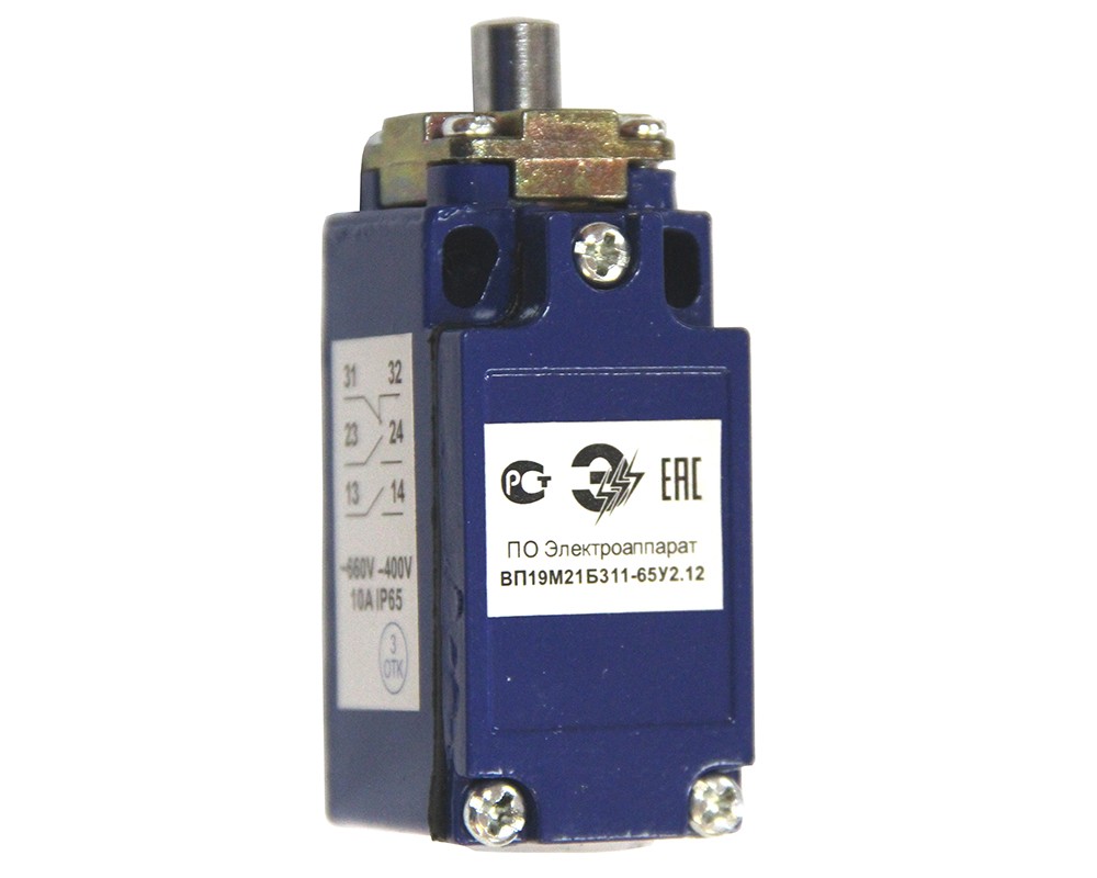 Выключатели путевые ВП19 предназначены для коммутации электрических цепей управления переменного тока напряжением до 660В частотой 50Гц и постоянного тока напряжением до 400В под воздействием управляющих упоров в определенных точках пути контролируемого объекта Количество полюсов: 3 Контактная группа: 2НО+1НЗ Тип привода: толкатель Материал корпуса: силумин Степень защиты: IP65 Габаритные размеры: 78х30х34 мм Номинальный коммутируемый ток — 10А (АС11, 220В) Номинальное рабочее напряжение: до 660В переменного тока частотой 50Гц, до 400В постоянного тока Тип переключающего устройства: прямого действия Климатическое исполнение: У2, Т2 Классификация Выключатели классифицируются по: группам коммутационной износостойкости, количеству полюсов, виду привода, способу крепления, степени защиты, климатическому исполнению и категории размещения, порядку замыкания контактов, комбинации замыкающих и размыкающих контактов. Технические характеристики: Номинальный коммутируемый ток –10А (АС11, 220В), Номинальное рабочее напряжение: до 660В переменного тока, до 440В постоянного тока, Минимальное напряжение, при котором могут работать выключатели на переменном и постоянном токе – 12В, Усилие срабатывания – не более 40Н, Материал корпуса – силумин, Вид переключающего устройства – мгновенного действия, прямой рабочий ход, не менее: 4мм для привода - толкатель, 40º для привода – рычаг, полный ход, не более: 10,5мм для привода - толкатель, 90º для привода –рычаг, Механическая износостойкость, циклов ВО, не менее: 20 000 000, Коммутационная износостойкость, при скорости перемещения управляющего упора 0,05м/с, при частоте включений 1200 циклов ВО в час и продолжительности включений (ПВ=40-60%), не менее: на переменном токе: 2 000 000, на постоянном токе: 2 000 000, Ввод внешних проводов через гермоввод (сальник MG20х1,5). Каждый зажим допускает присоединение медных проводников сечением до 2х1,5 мм2 или один до 4 мм2. Климатическое исполнение и категория размещения –У2.