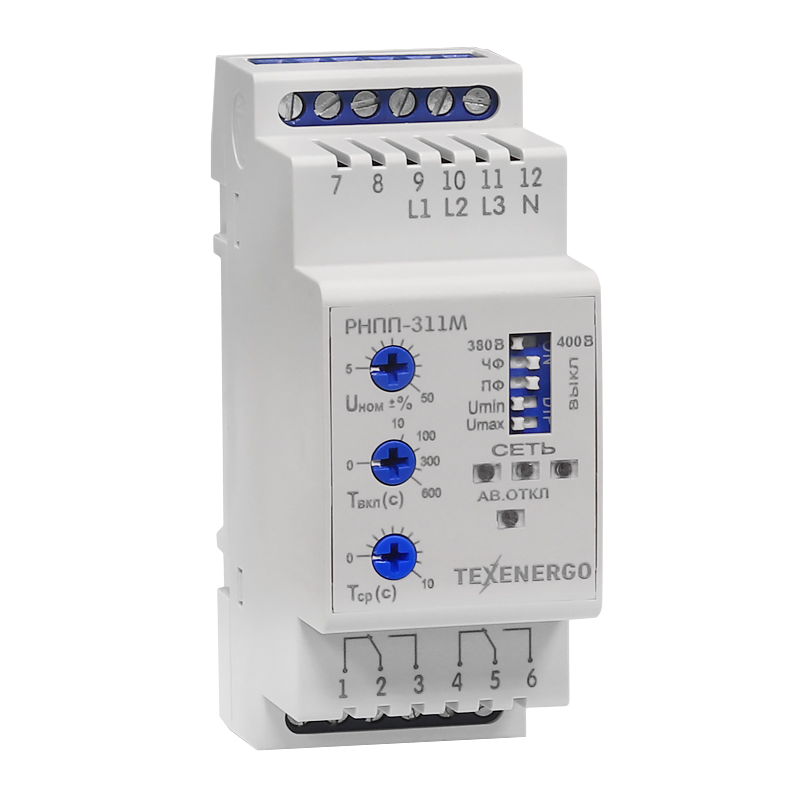 Многофункциональное реле напряжения, перекоса и последовательности фаз РНПП-311М является модификацией реле РНПП-311 и предназначено для: • контроля допустимого уровня напряжения, • контроля правильного чередования и отсутствия слипания фаз, • контроля полнофазности и симметричности сетевого напряжения (перекоса фаз), • отключения нагрузки 380/220В 50Гц путем размыкания цепи питания нагрузки (коммутации электрических цепей постоянного и переменного тока) при некачественном сетевом напряжении. Время срабатывания РНПП-311М задается пользователем, • контроля качества сетевого напряжения после отключения нагрузки и автоматического включения ее после восстановления параметров напряжения. Время автоматического повторного включения задается пользователем, • индицирования аварии при возникновении аварийной ситуации и индикации наличия напряжения на каждой фазе, В реле РНПП-311М предусмотрены возможности выбора типа контролируемой сети (380 или 400В) и набора защитных функций.