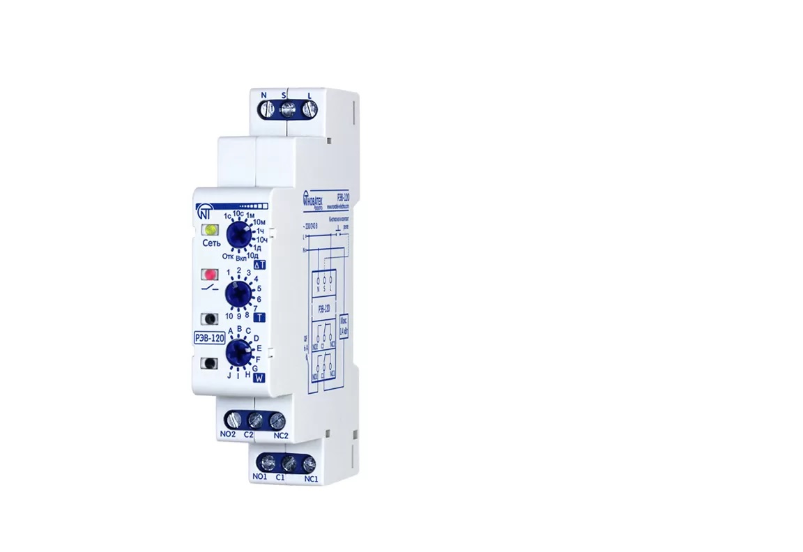 Реле времени РЭВ-120 является микропроцессорным устройством, предназначенным для включения-выключения нагрузки через заданные пользователем интервалы времени. Модель РЭВ-120 - питание 220В. Прибор монтируется на стандартную дин рейку и занимает всего один модуль в щите. Прибор имеет два выходных канала с нормально открытыми и нормально закрытыми контактами. Так же на лицевой части прибора находятся: регулятор установки временного интервала «∆T», регулятор установки времени «Т», регулятор установки режима работы «W». В РЭВ-120 предусмотрено десять режимов работы: - задержка на включение, - выдержка времени при подаче питания, - периодический с задержкой при включении, - периодический с выдержкой времени при включении, - задержка на отключение (при размыкании управляющего контакта), - импульсный 1 (при замыкании управляющего контакта), - импульсный 2 (при размыкании управляющего контакта), - задержка включения-выключения (по управляющему контакту), - шаг реле нагрузки (при каждом замыкании управляющего контакта), - генератор импульса 0,5 с. Таблица режимов и временных интервалов находится в паспорте устройства. До подключения изделия его необходимо настроить. Настройка изделия выполняется в следующем порядке: первым делом нужно установить режим работы (следует перевести регулятор установки режима в крайнее левое положение, независимо от того в каком положении стоит регулятор, после чего по часовой стрелке установить необходимый режим), затем необходимо установить временной интервал регулятором «∆T», далее необходимо регулятором «Т» установить время. Следует отметить, что при изменении режима работы или временных интервалов изделия при поданном напряжении питания, необходимо учитывать, что изменения вступят в силу только после отключения (на время не менее 1 с) и повторного включения питания изделия.